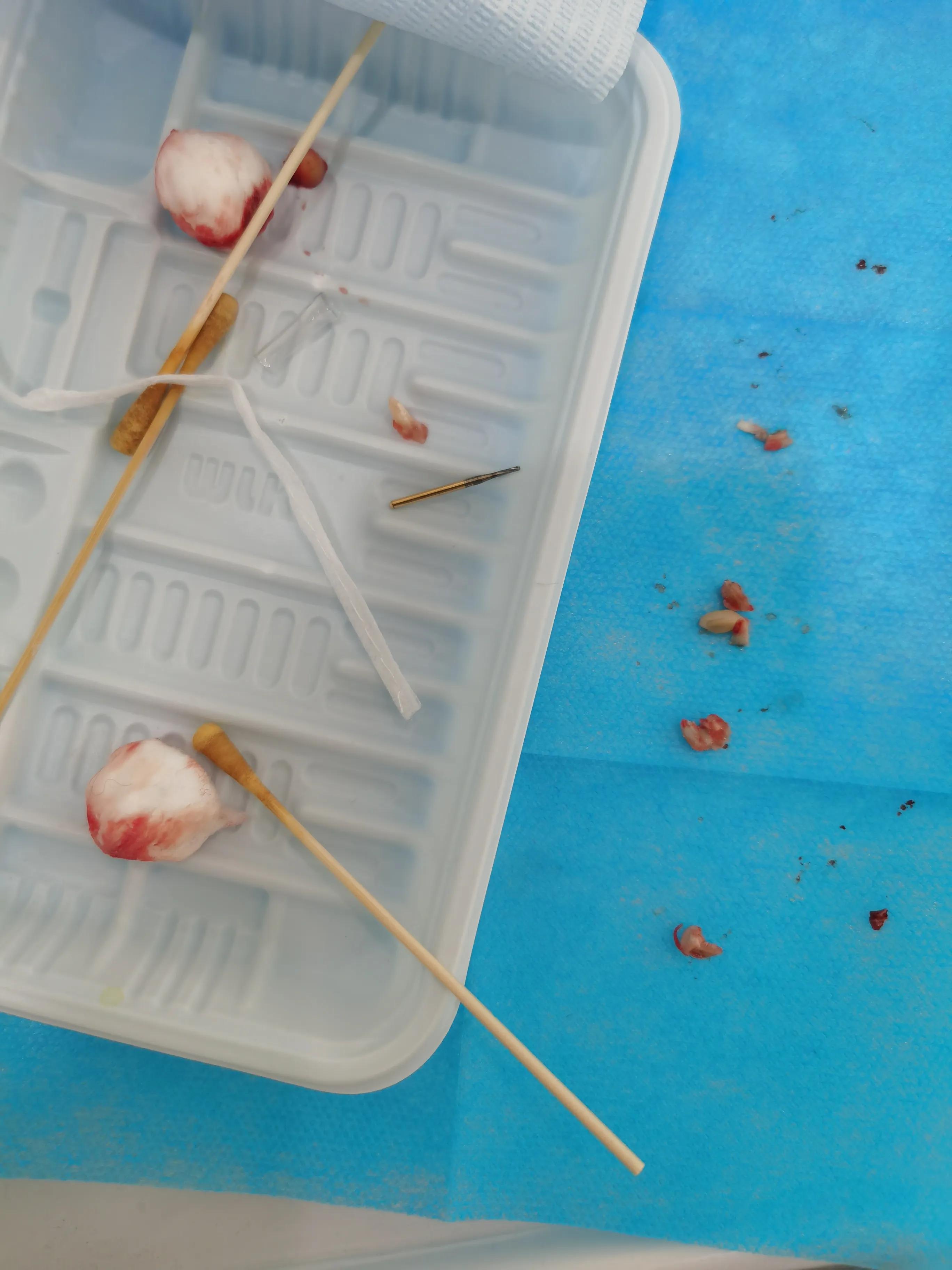 诊所的医生和护士态度都很好,我的心情也比较放松。拔牙过程大概半个小时,而且这一次拔牙没有用刀片开一个伤口,所以也根本就没有缝针,这是让我惊喜的地方。那颗阻生齿以碎牙齿的方式被一一夹了出来。