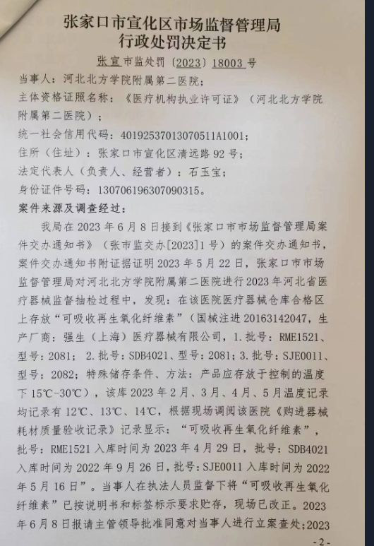未按要求贮存医疗器械,河北北方学院附属第二医院被罚2.5万 2023-12-04 寻医问药 18752 作者:贝莱孕育 张家口市宣化区人民政府网站19日发布行政处罚信息,河北北方学院附属第二医院未按说明书和标签标示要求贮存医疗器械被罚款2.5万元。行政处罚决定书如下: